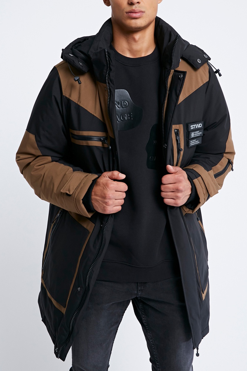 Parca com capuz pressionável amovível com atilhos de ajuste.