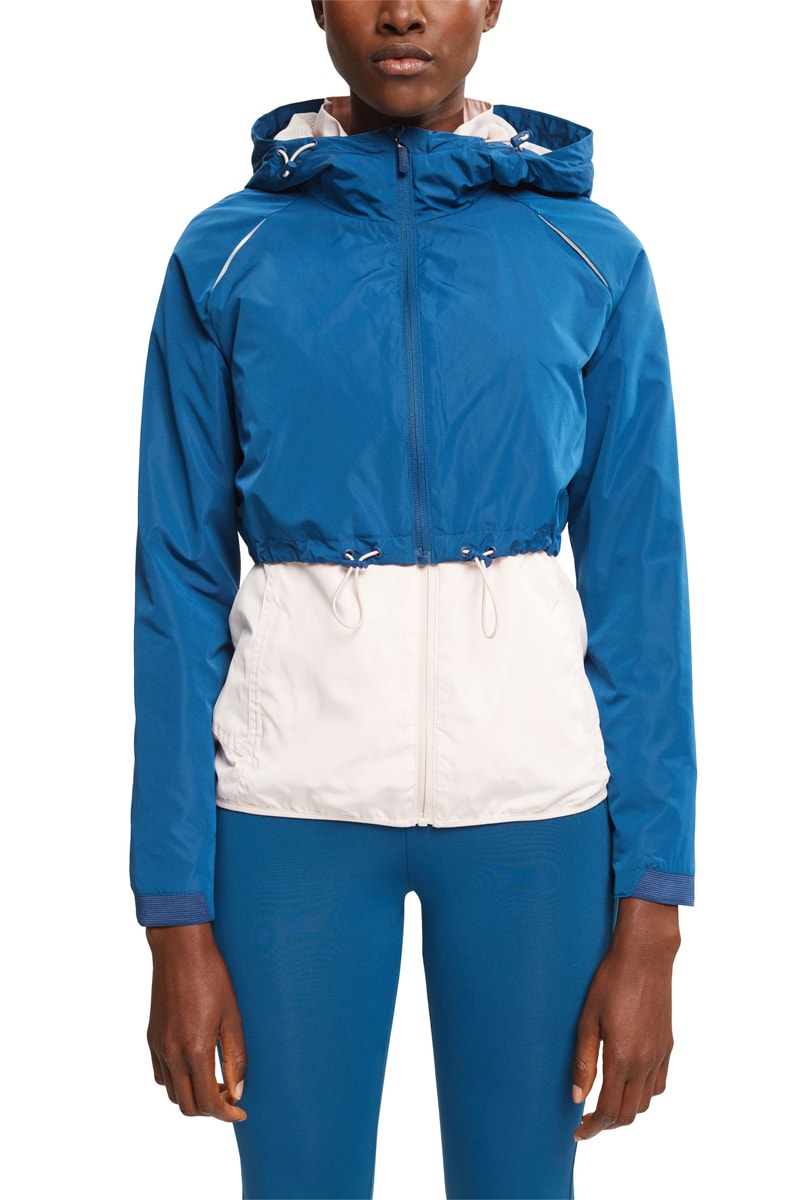 Capuz com atilhos de ajuste e travões de cordão.
