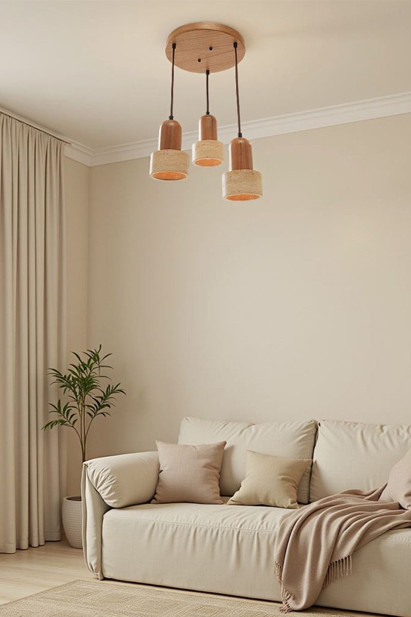 Candeeiro suspenso em travertino com revestimento em madeira - Imitação de carvalho - 3 x 40 W