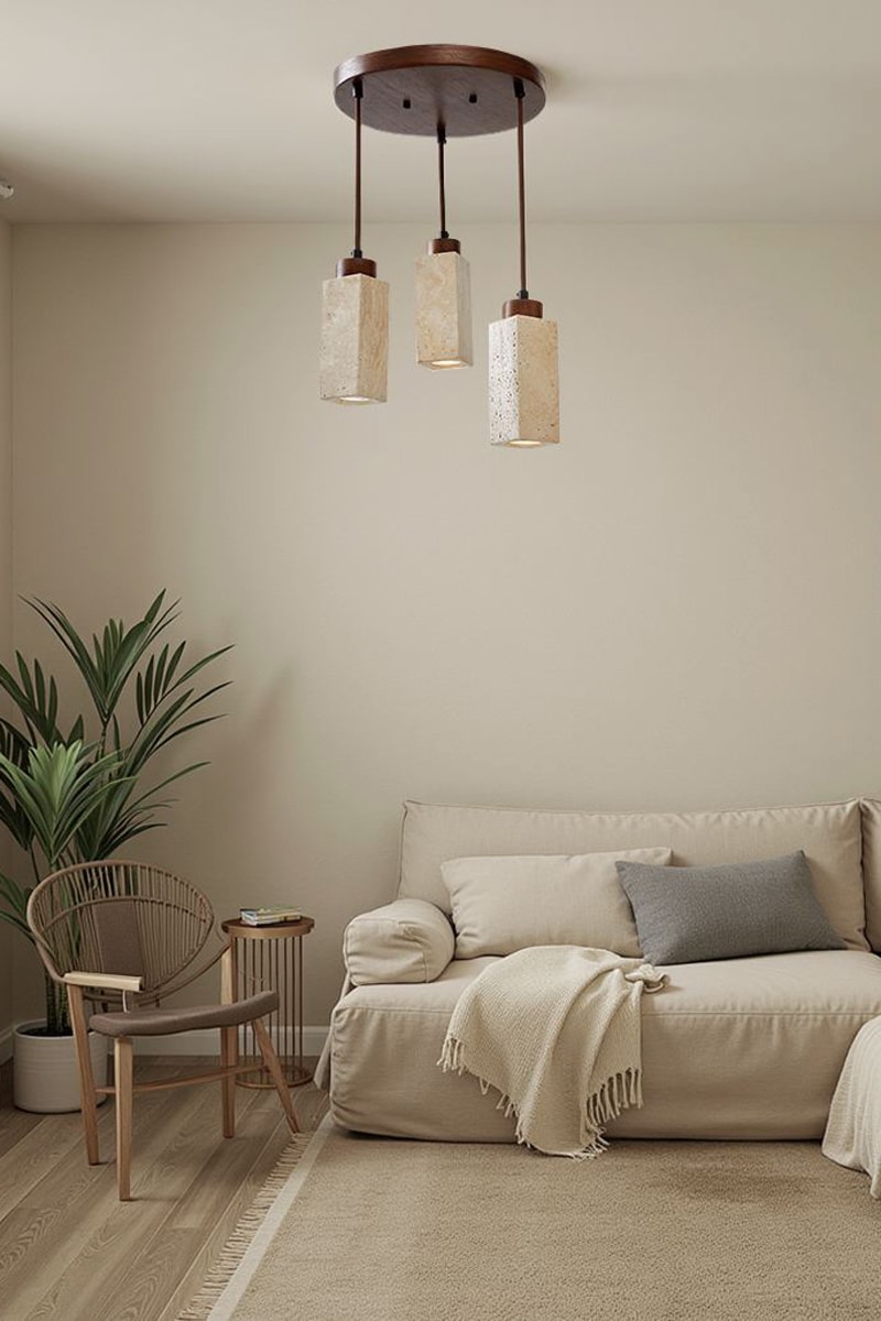 Candeeiro suspenso em travertino com revestimento em madeira - Natural - 3 x 10 W