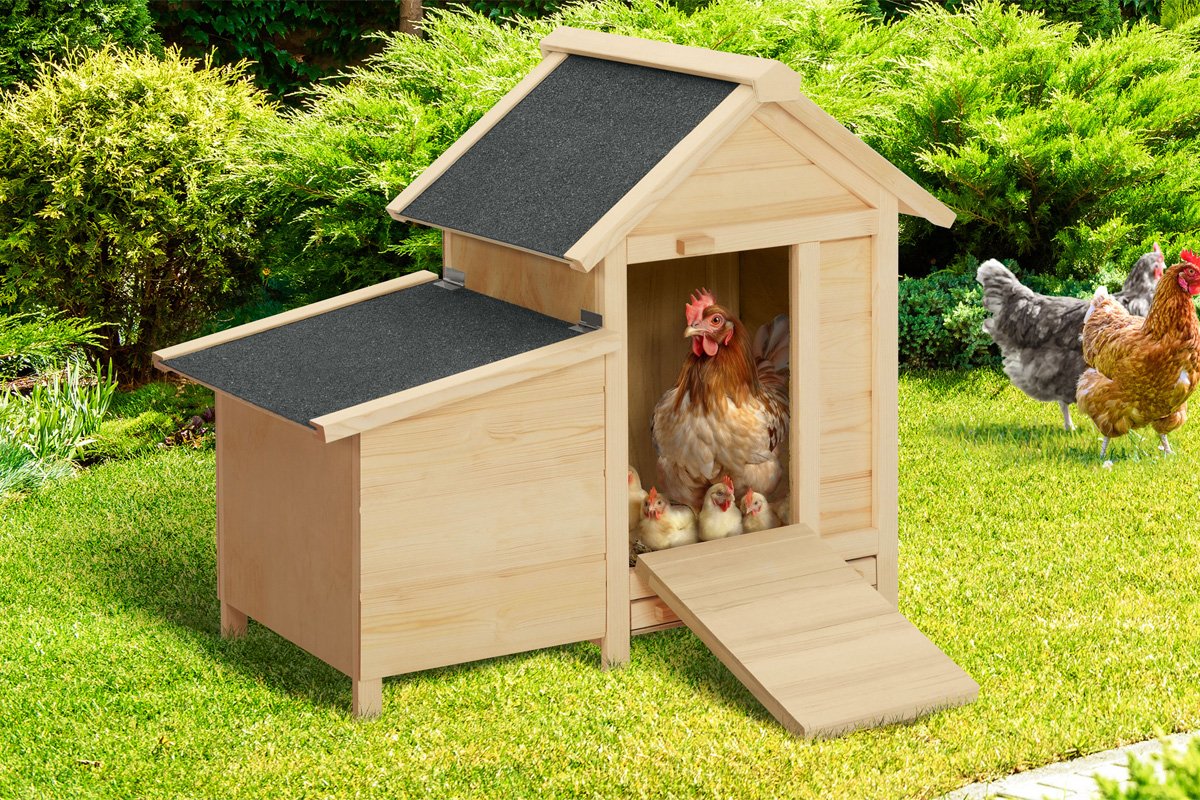 Está equipado com um poedouro com telhado elevável que permite um acesso fácil aos ovos.
