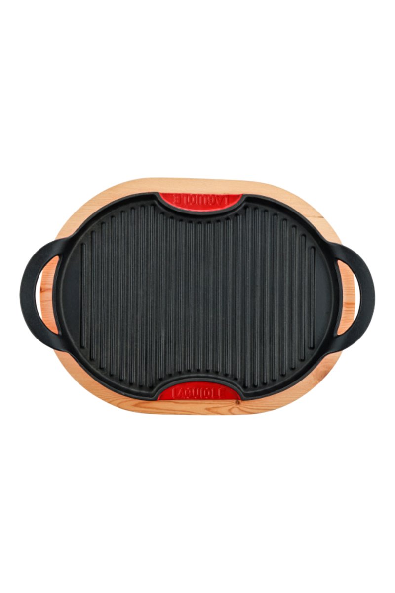 Grelhador oval em ferro fundido esmaltado com suporte de madeira.