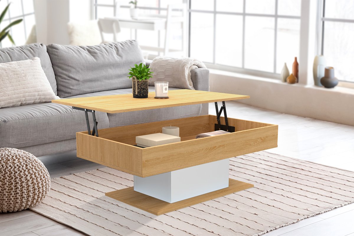 Mesa de centro com tampo elevável - Imitação madeira e branco