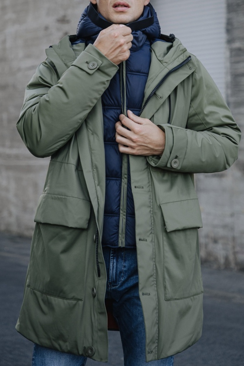 Cordão de ajuste na cintura, em baixo da roupa e capuz.