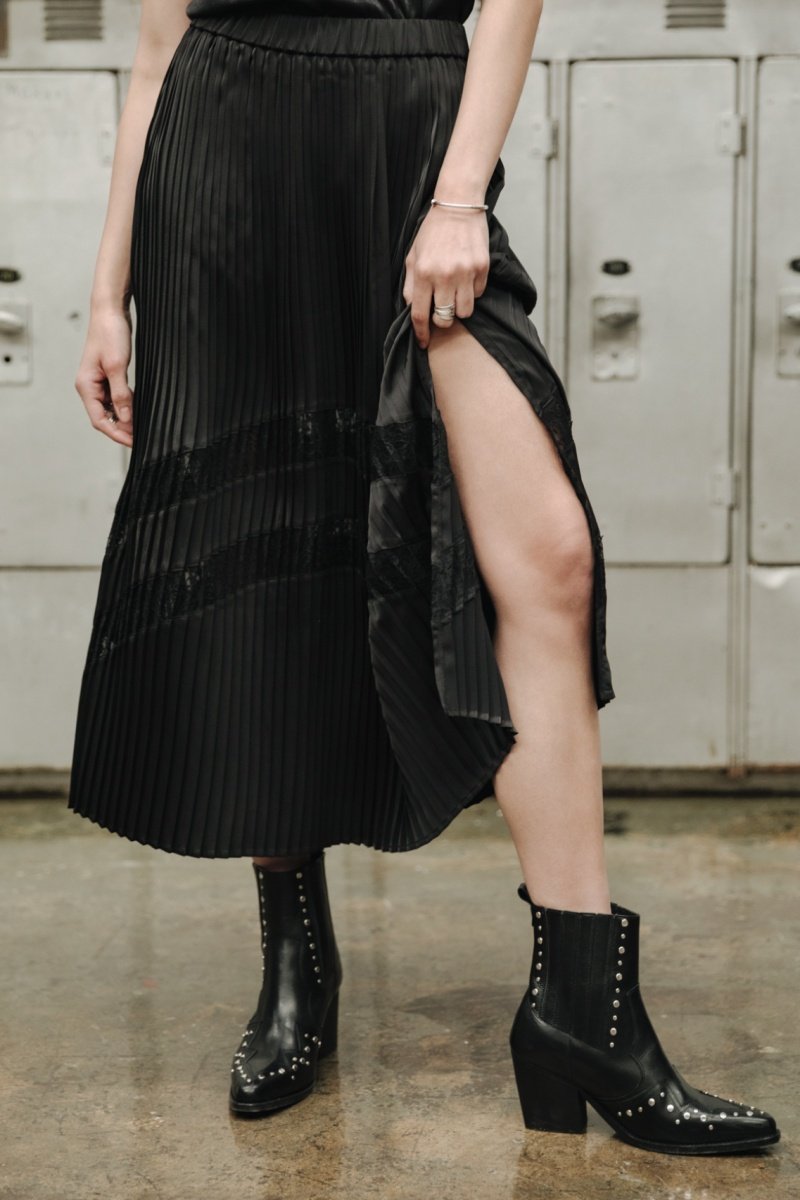Saia comprida completamente plissada lisa, levemente acetinada.