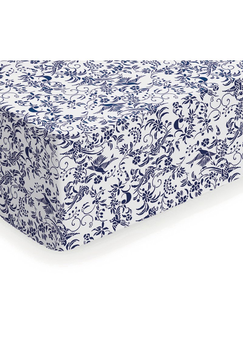 Lençol-capa em cetim de algodão 200 fios/cm² Birds - Branco e azul