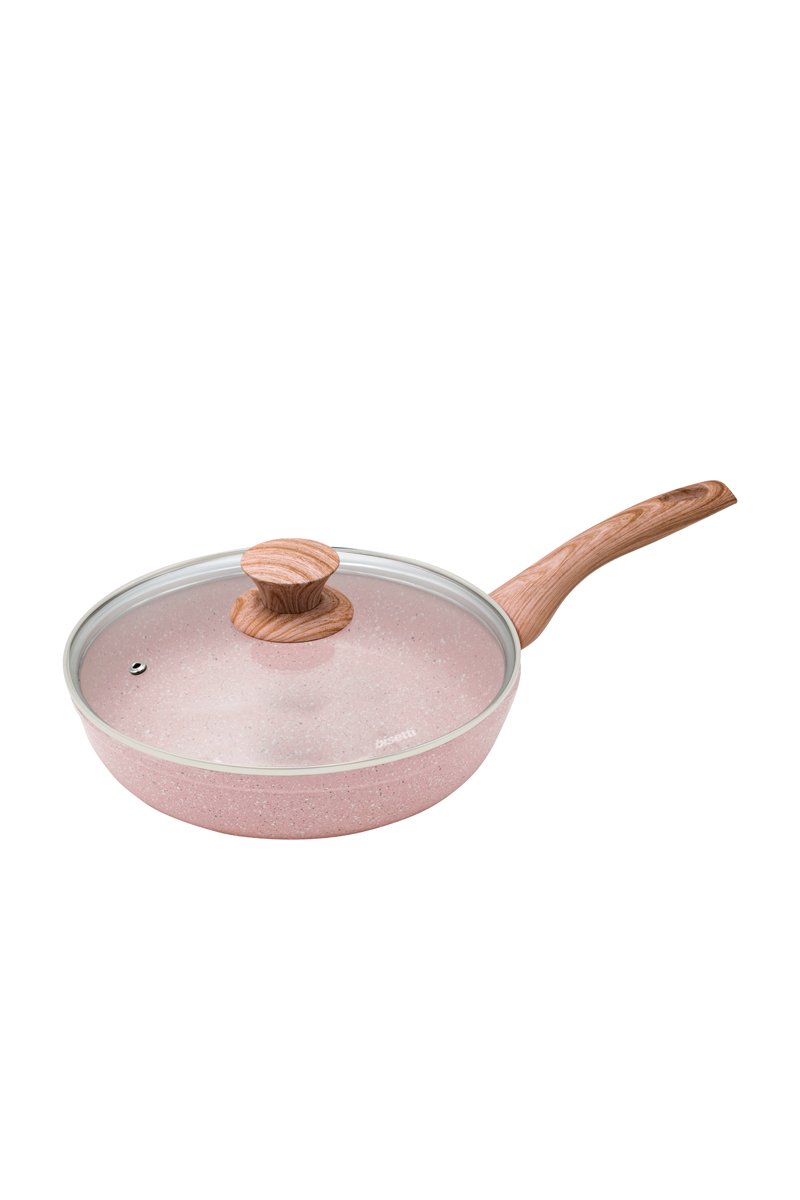 Frigideiras antiaderentes de alumínio com revestimento em pedra, pegas antiderrapantes soft-touch, anti-riscos, em partículas de granito rosa para uma cozinha: sã, sem gorduras e saborosa.