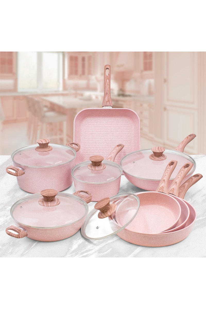 Frigideiras antiaderentes de alumínio com revestimento em pedra, pegas antiderrapantes soft-touch, anti-riscos, com partículas de granito rosa para uma cozinha: saudável, sem gorduras e saborosa.