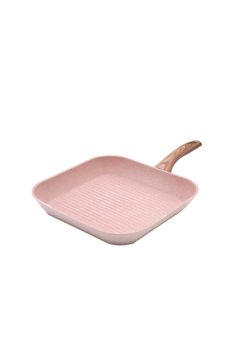 Frigideiras antiaderentes de alumínio com revestimento em pedra, pegas antiderrapantes soft-touch, anti-riscos, em partículas de granito rosa para uma cozinha: sã, sem gorduras e saborosa.
