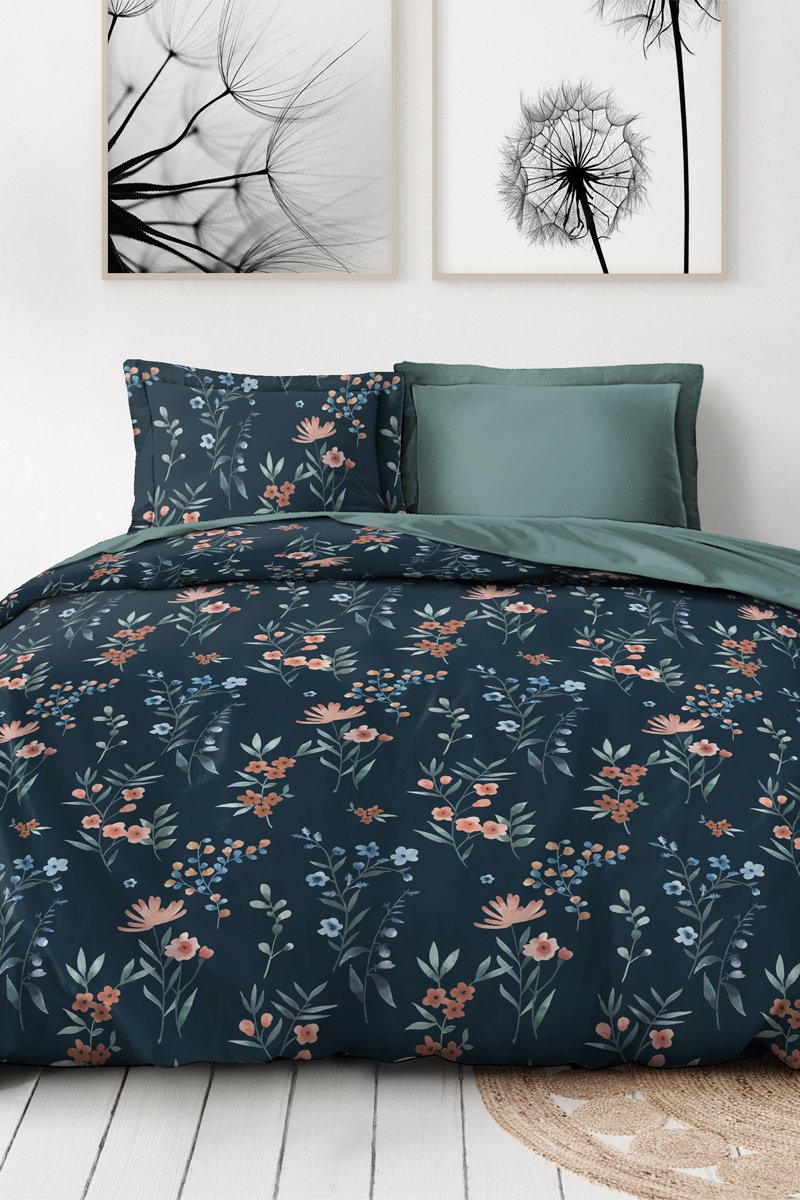 Conjunto de edredão em percal de algodão 80 fios/cm² La Flamboyante - Azul-noite e rosa