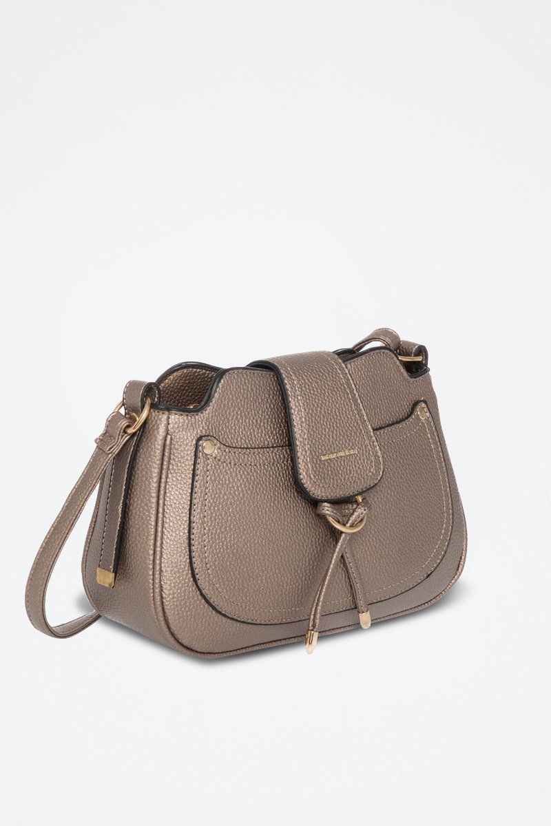 Argola metálica decorativa, bolso exterior e logótipo à frente.