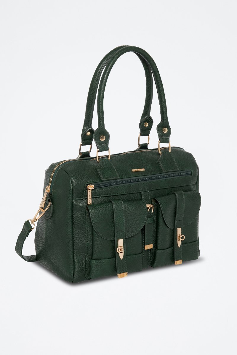Bolso exterior com zip, 2 compartimentos exterior com aba e tiras, tira com fivela e placa metálica com logótipo à frente.