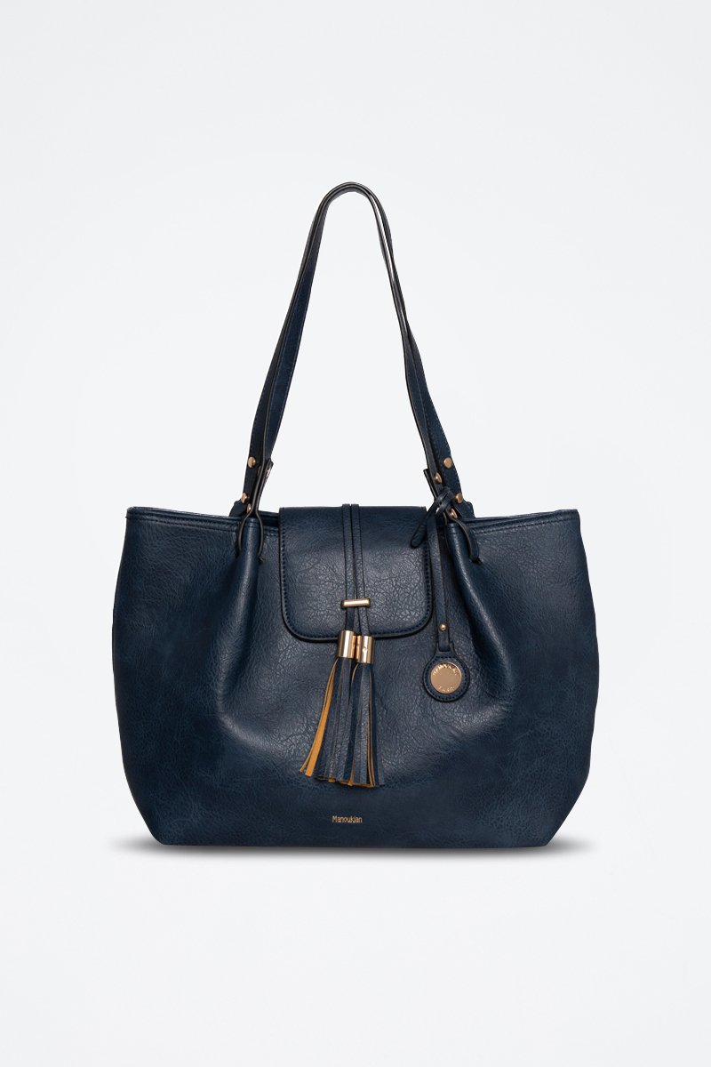 Fecho com aba e atilhos sob fivela com pompons decorativos.