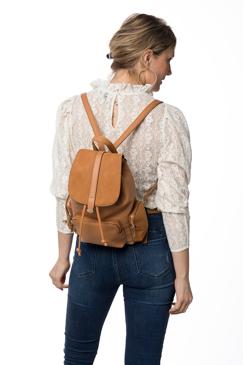 Bolso com fecho zip, tira com aplicação e logótipo metálicos à frente.