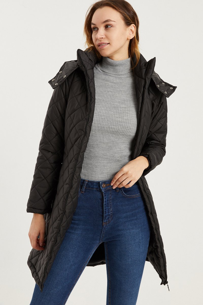 Blusão comprido com capuz amovível.
