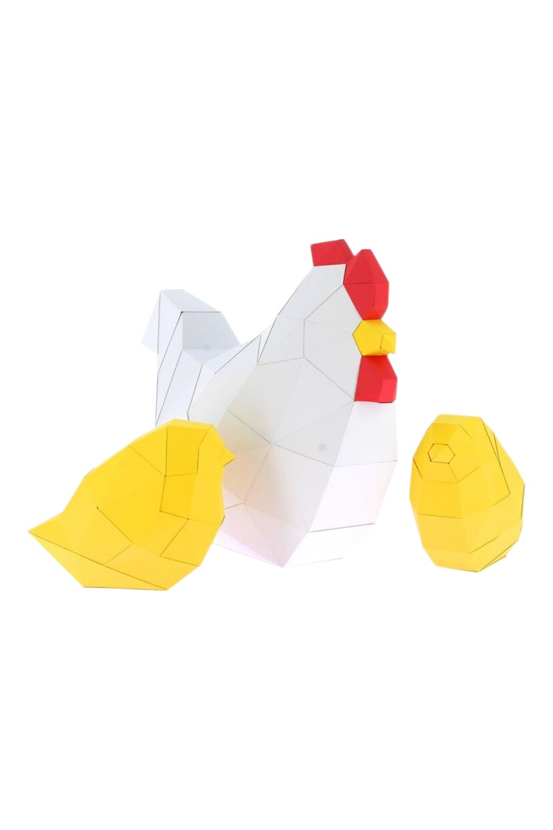 Escultura 3D Galinha e seus pintainhos - 24 x 35 x 17 cm - Amarelo e branco