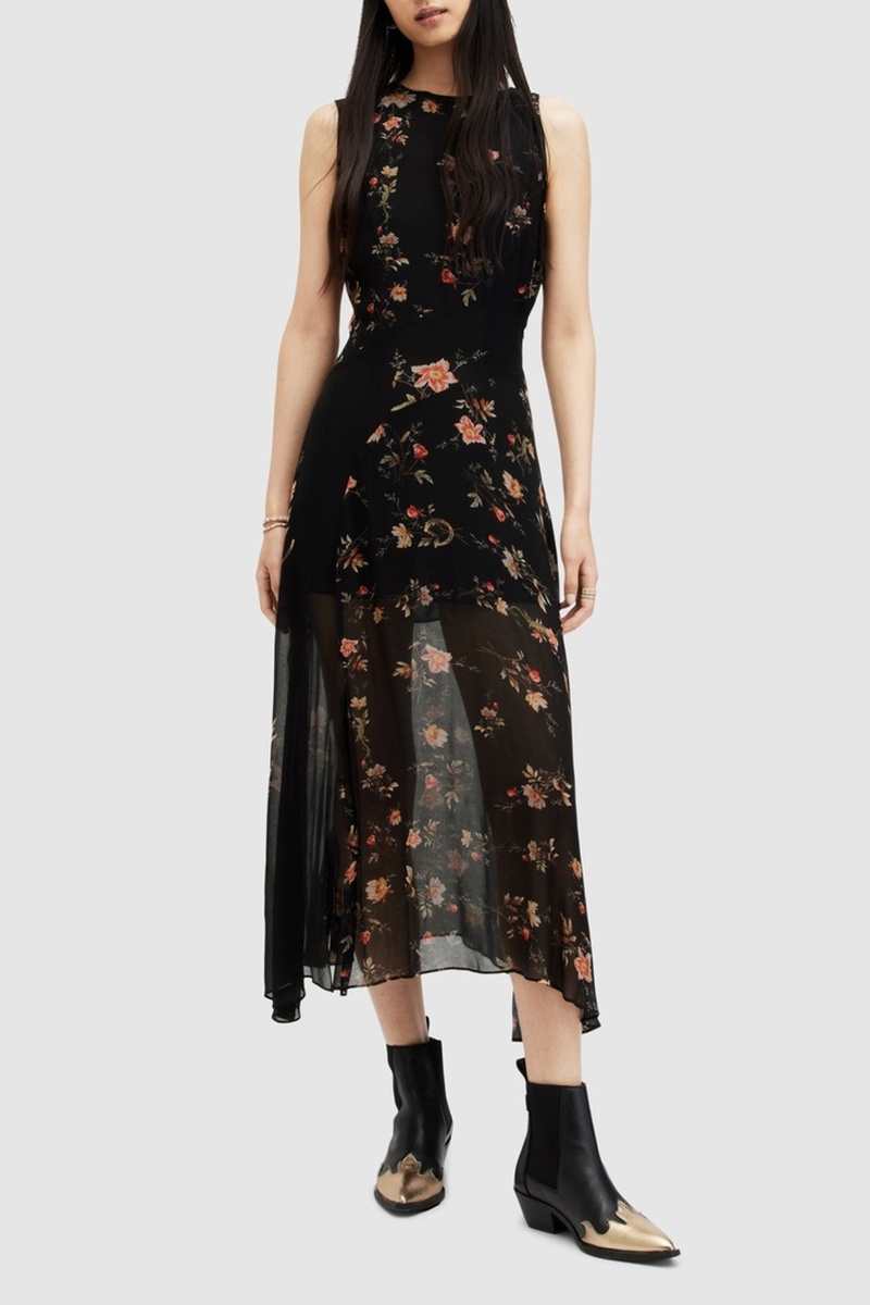 Vestido midi sem mangas.
