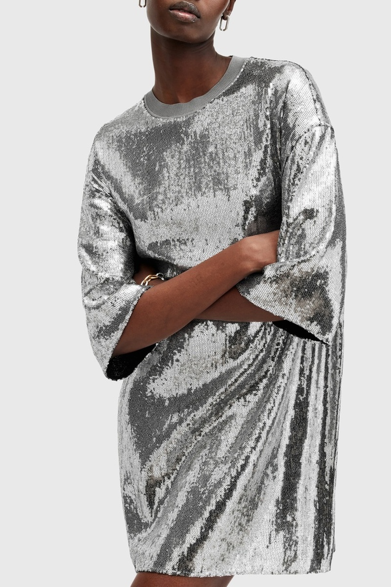 Vestido trapézio com lantejoulas de mangas semi-compridas.