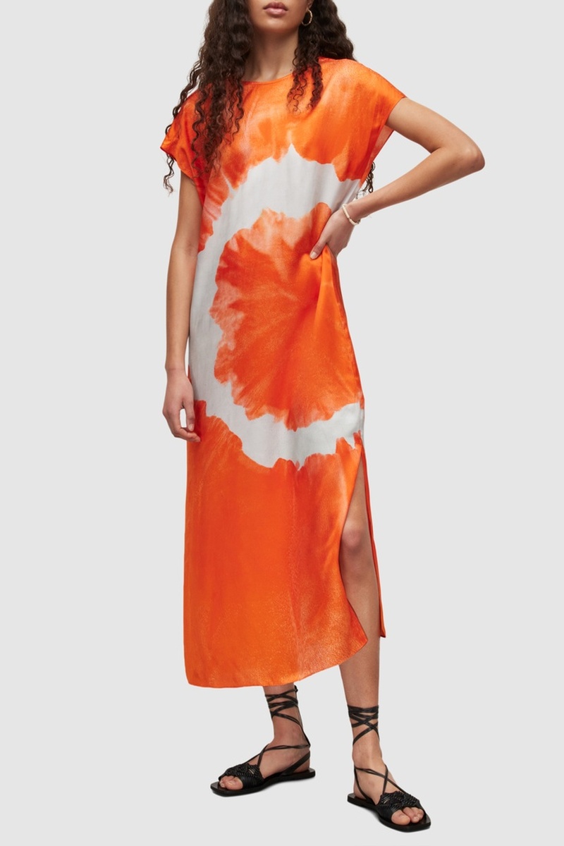 Vestido midi tie and dye em seda misturada de mangas curtas.