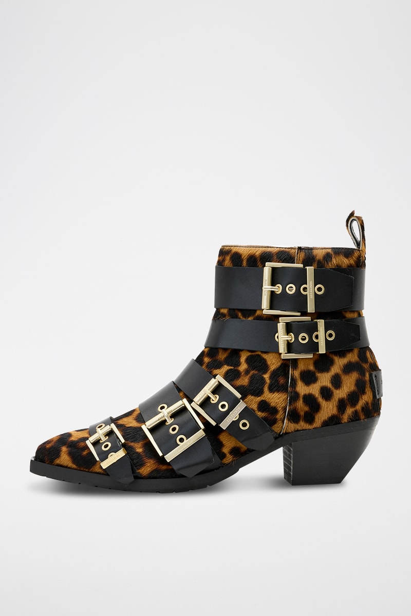 Fecho com tiras de fivela do lado exterior e com zip do lado interior.