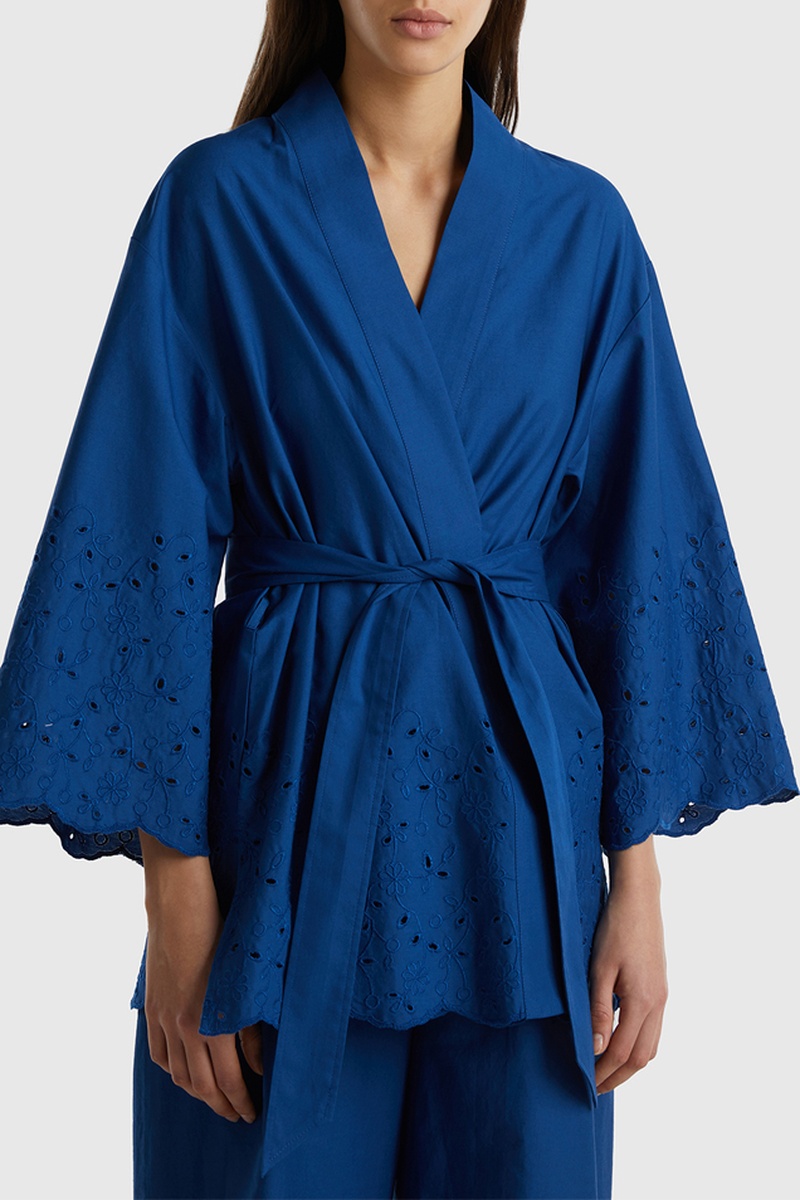 Bordado inglês nas mangas, à frente e atrás.