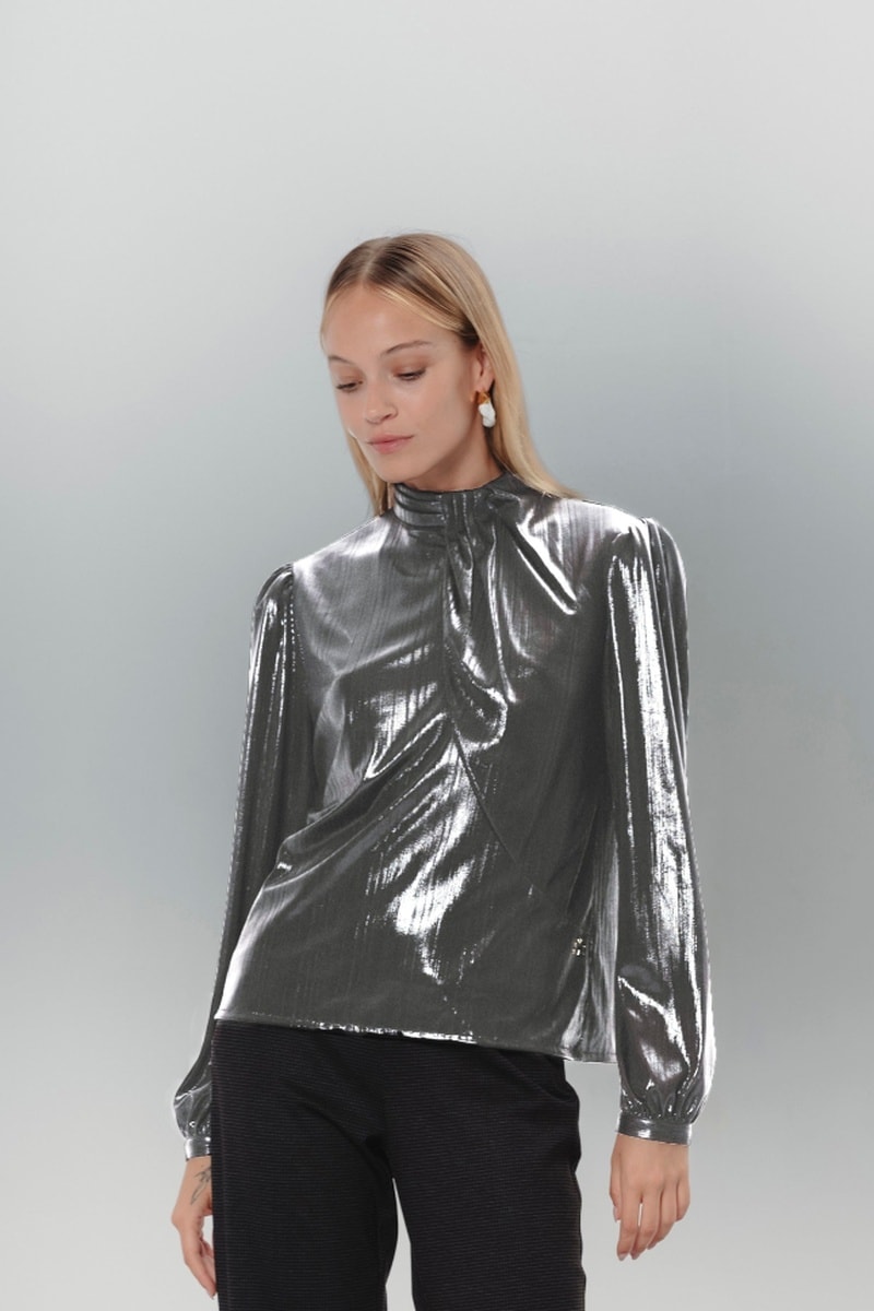 O modelo mede 1 m 77 e veste o artigo no tamanho 36 - XS.