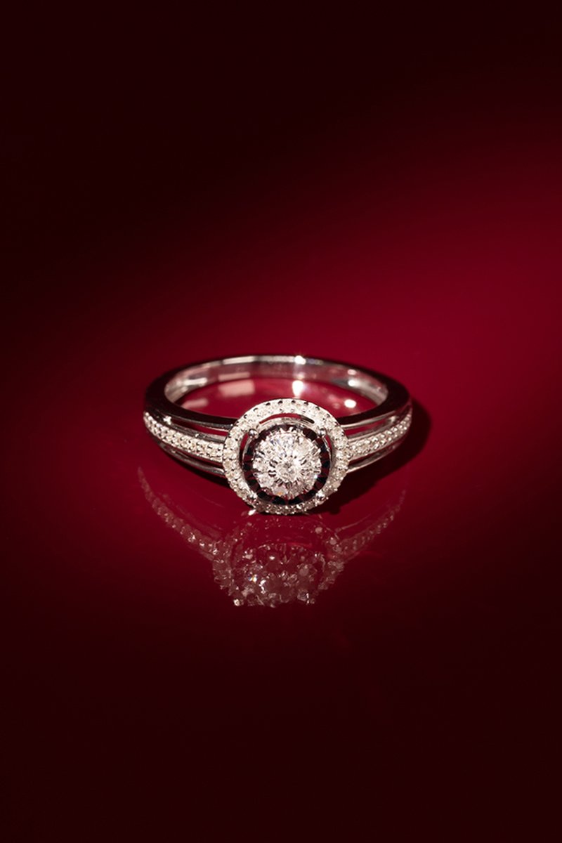 Anel solitário de ouro branco com 61 diamantes.