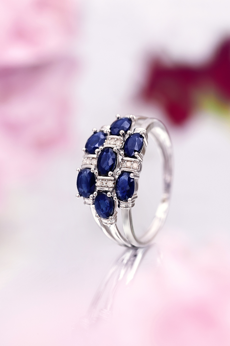 Anel de ouro branco incrustado com 7 safiras e 12 diamantes.