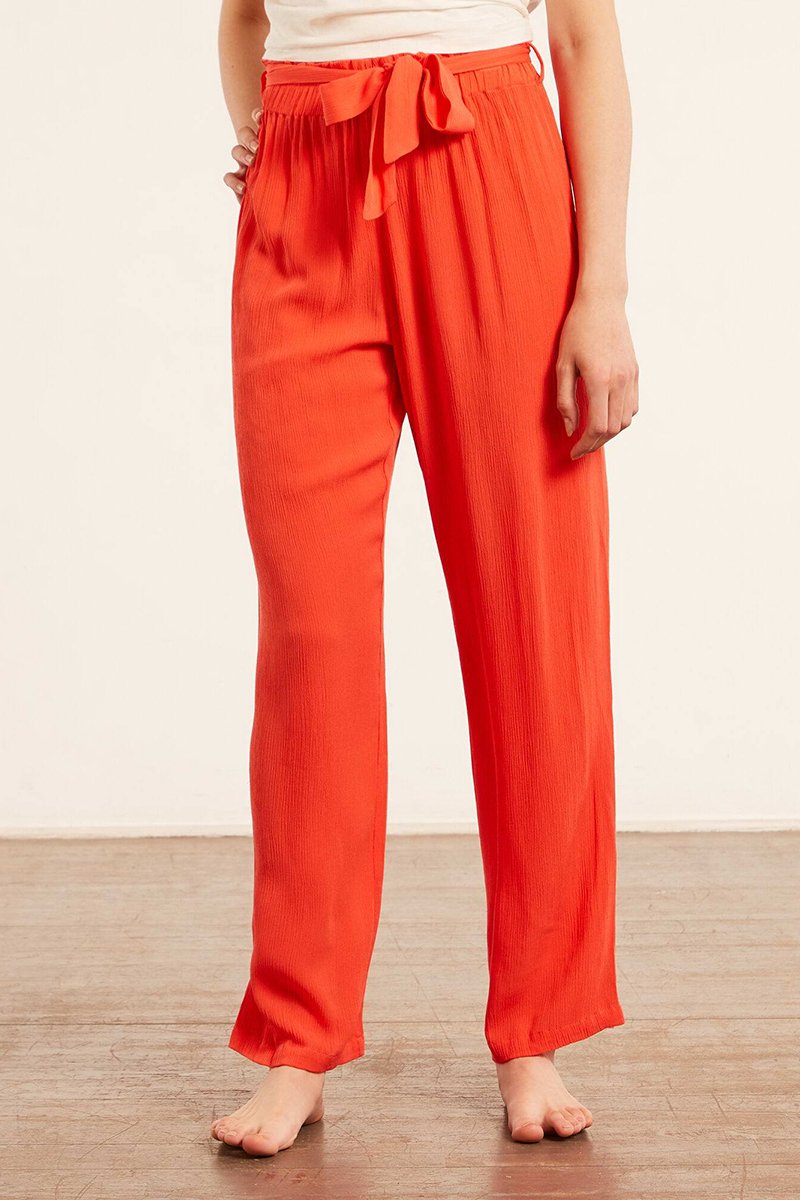 Cintura elástica com folhos com atilhos sob presilhas de atar.