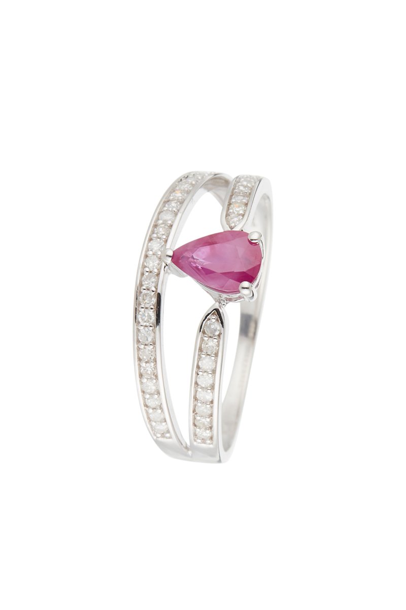Anel de ouro branco com 37 diamantes e um rubi.