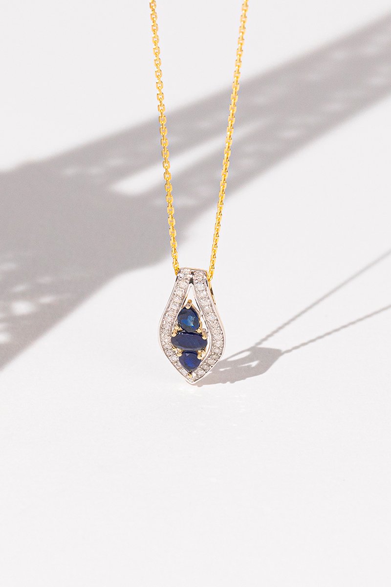 Pendente de ouro amarelo com 31 diamantes e 3 safiras.