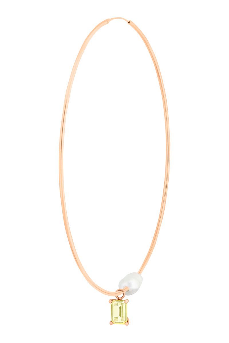 Argola em ouro rosa com um quartzo e uma pérola de imitação.
