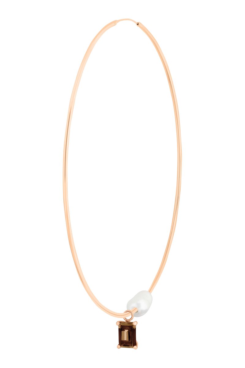 Argola em ouro rosa com um quartzo e uma pérola de imitação.