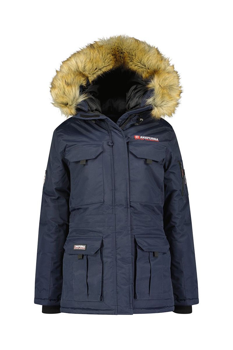 Capuz com atilhos de ajuste, travões de cordão, pelo sintético amovível e tira regulável.