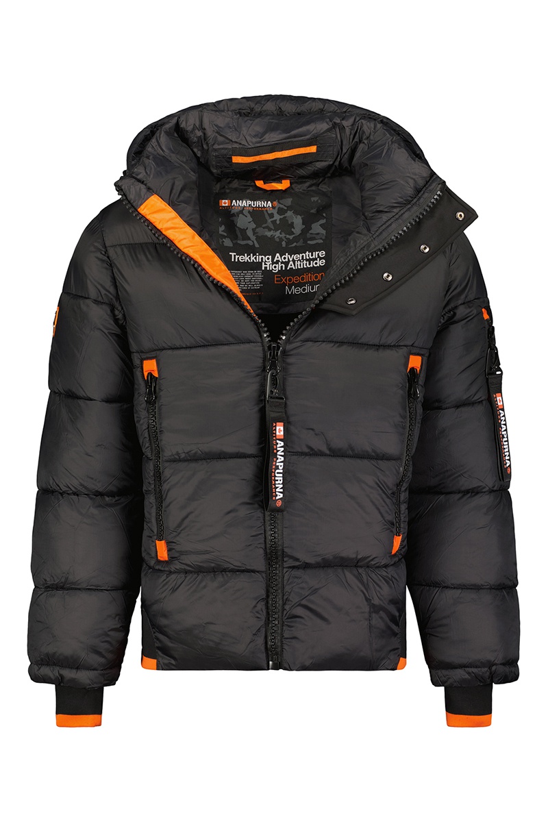 Blusão com capuz amovível, atilhos de ajuste e travões de cordão.