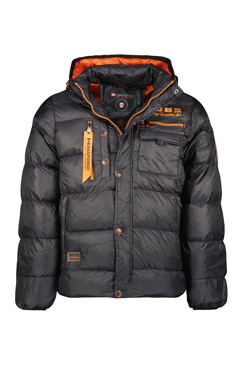 Blusão com capuz amovível, atilhos de ajuste, travões de cordão, aplicação e inscrição.