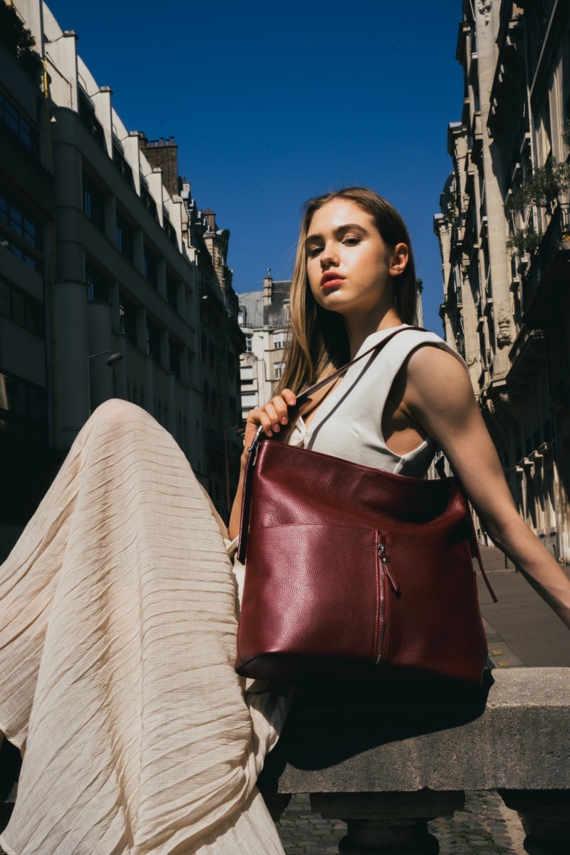 3 bolsos dos quais 1 com fecho zip e logótipo em relevo à frente.