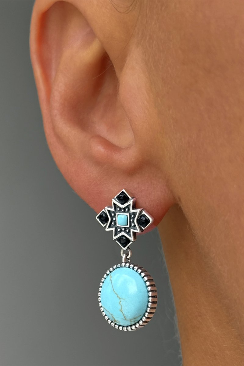 Boucles d'oreilles pendantes en argent serties de 2 turquoises synthétiques et de 4 onyx synthétiques.