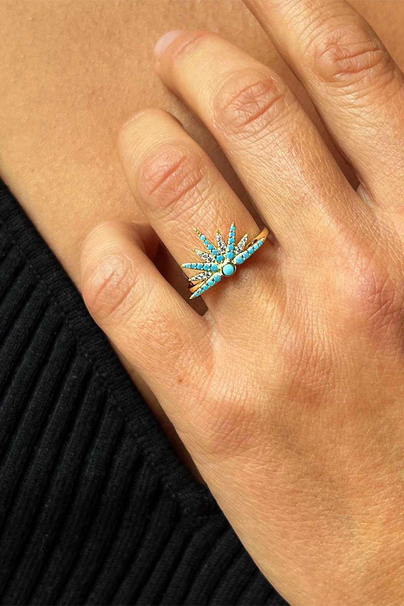 Anel em prata banhada a ouro amarelo com turquesas sintéticas.