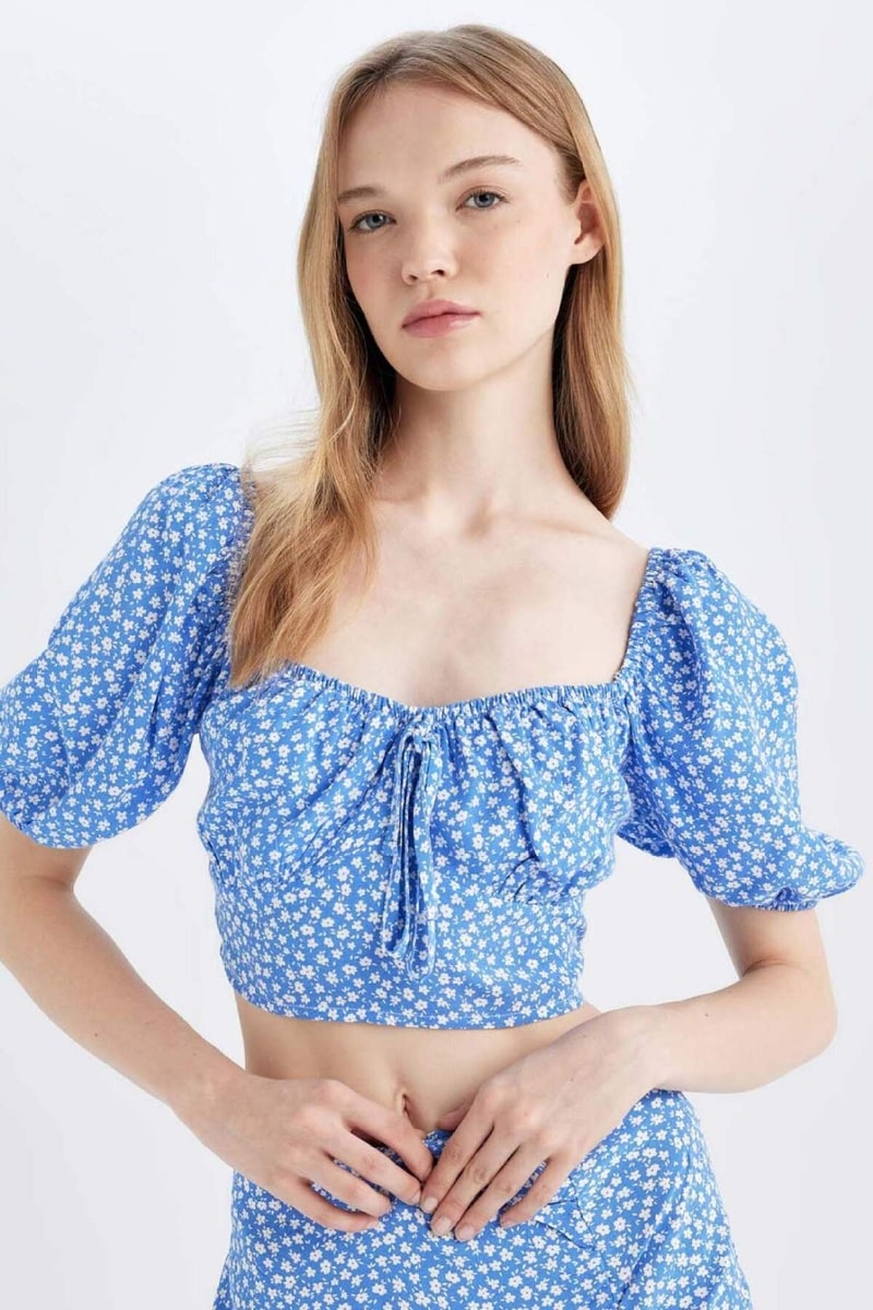 Crop top de mangas semi-compridas volumosas.