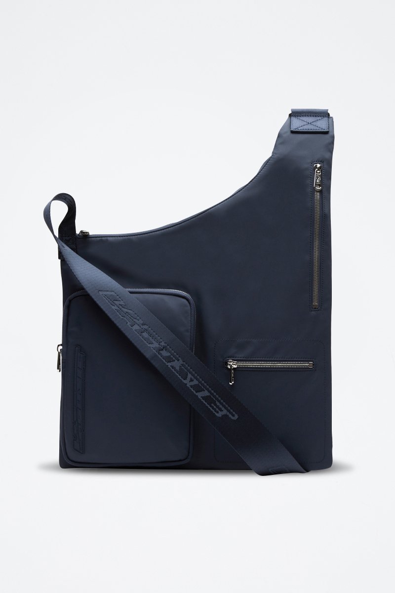 3 bolsos com fecho zip e logótipo em relevo à frente.