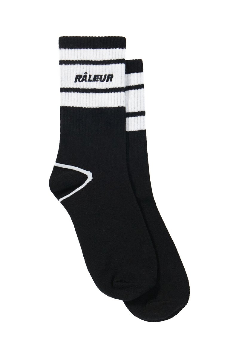 Inscrição bordada, estampado às riscas e malha canelada no cano.