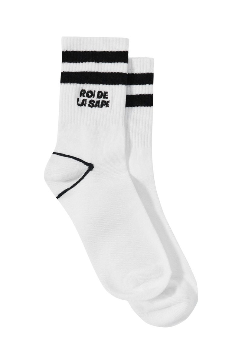 Inscrição bordada, estampado às riscas e malha canelada no cano.