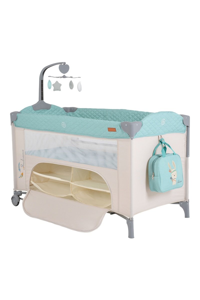 Cama dobrável com rodas e móbile musical com 4 peluches.
