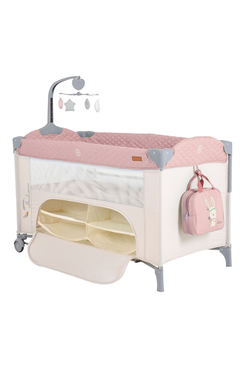 Cama dobrável com rodas e móbile musical com 4 peluches.