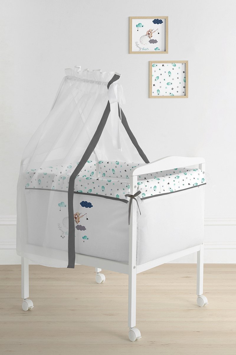 Conjunto berço em madeira e têxtil de cama composto por: