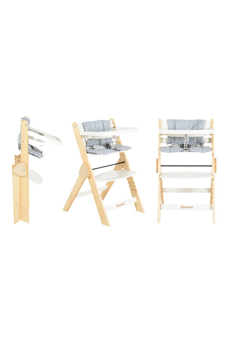 Cadeira alta evolutiva dobrável em madeira.