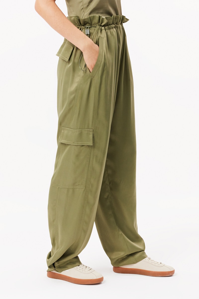 Cintura elástica com atilhos de ajuste e travões de cordão.