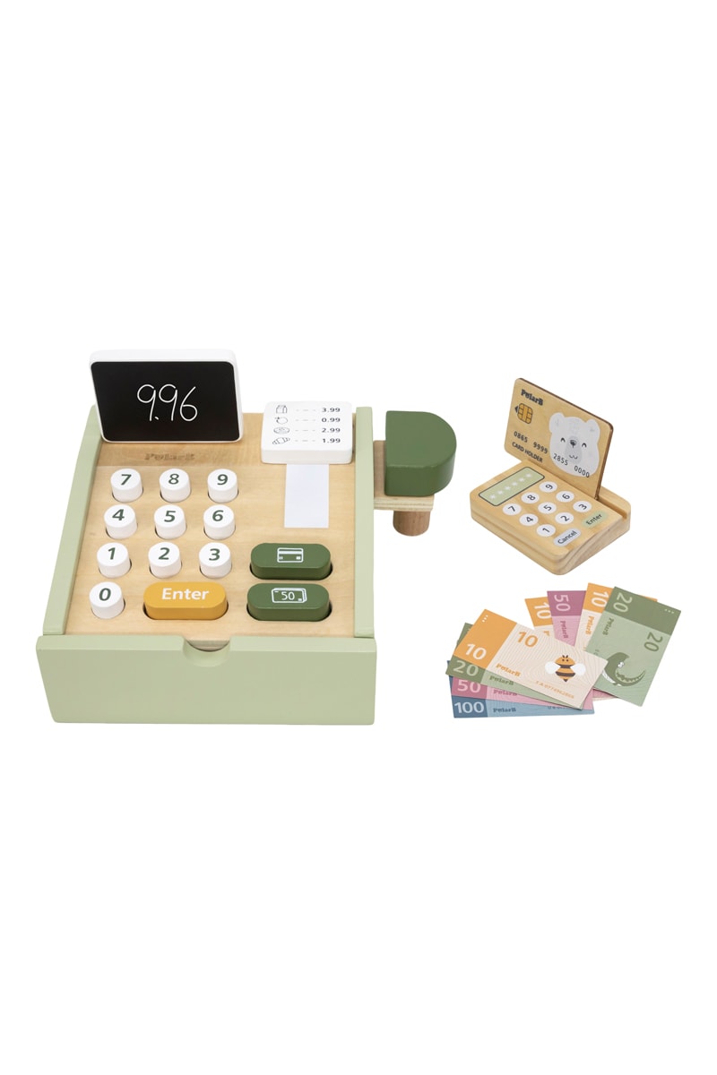 Como uma verdadeira caixa registadora, esta está equipada com um scanner, um leitor de cartão SDXC, um rolo de recibos, um pequeno quadro negro, cartão bancário e algumas moedas guardadas na gaveta.