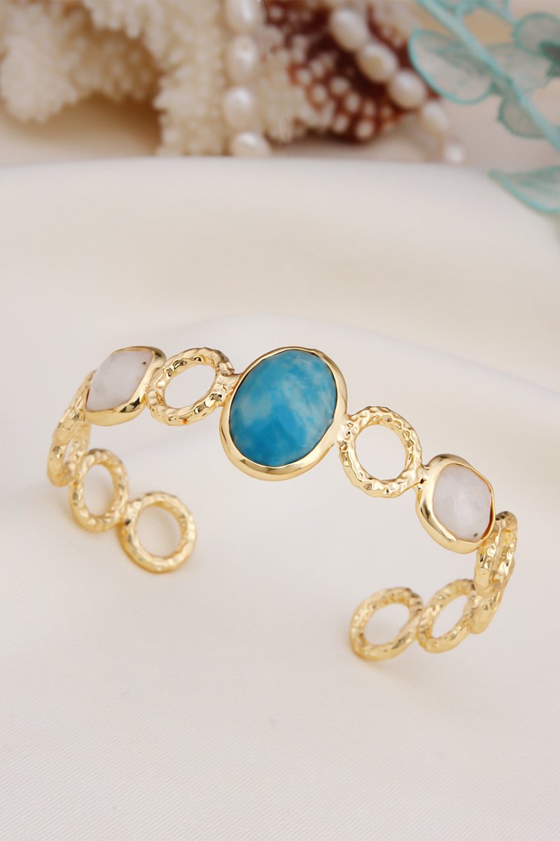 Pulseira rígida aberta banhada a ouro amarelo com 2 pedra da lua e um larimar.